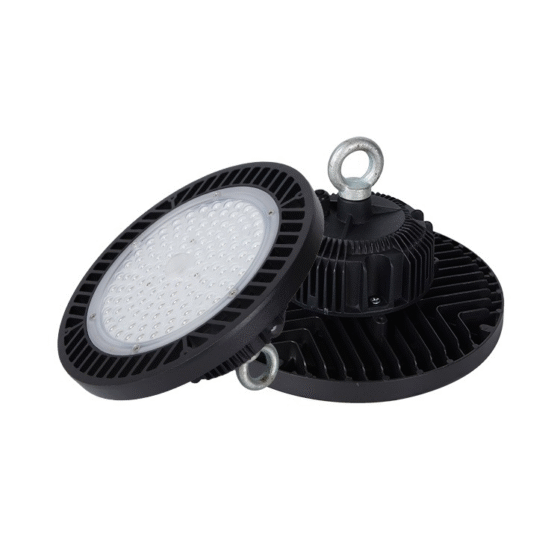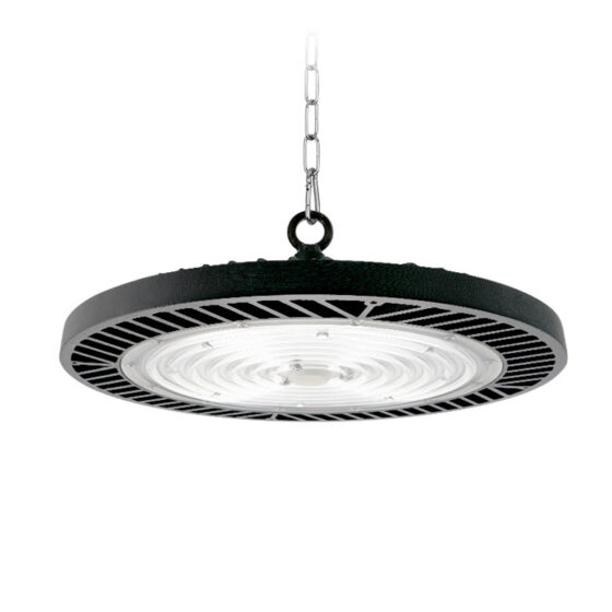 This 150W UFO LED High bay light is a kind of industrial lighting, with high brightness LED chips, the lumens output can range from 150lm/W. Compared with traditional high-bay light fixtures, it can save about 100% in energy and cost. 150W can reach 22500 lumen. There are different beam angle options, and can also be with an additional aluminum reflector cover. These cost-effective but high-lumen-output high bay lights are widely used for warehouses, gyms, and factories.