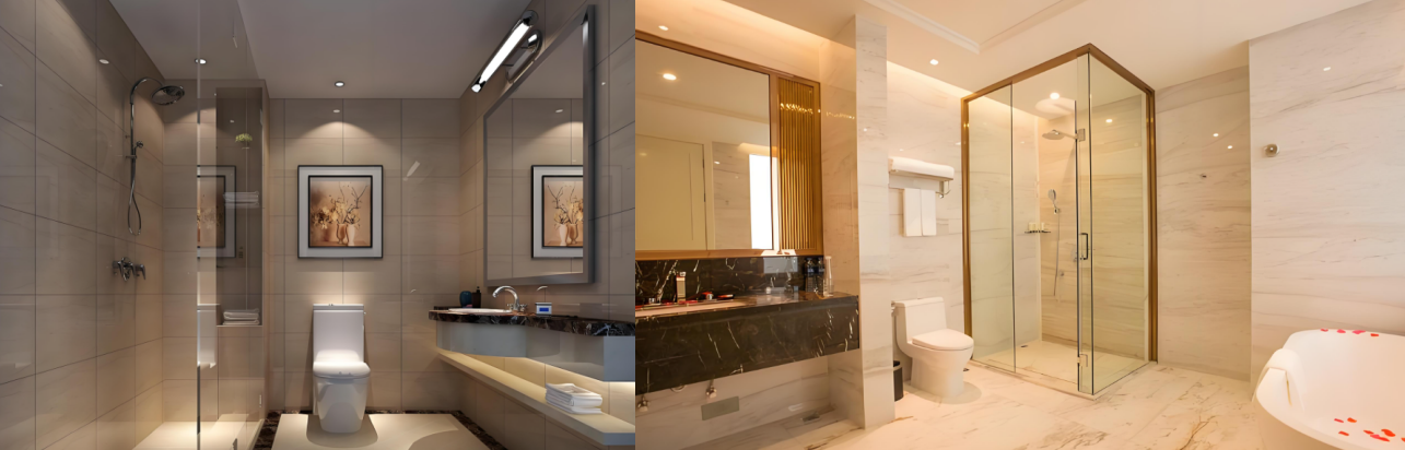 The guest rooms are the core area of the hotel, so lighting design is crucial. Create a warm and cozy environment through anti-glare downlights, recessed adjustable downlights, and flexible lighting options. In the bedroom, choose an LED light source below 3,500K; in the bathroom, choose a light source above 3,500K to highlight the clean and refreshing atmosphere. Also, avoid inaccurate wall lamp placement or improper lighting selection, which can affect the coordination of the interior design.