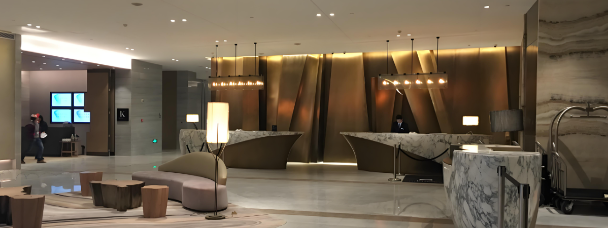 The lobby reception area emphasizes a balance between decoration and functionality. The top decoration can be concealed with light strips to add depth to the space. At the same time, considering the coordination between natural lighting and artificial lighting, large chandeliers or lanterns are usually used to highlight the hotel style. Recessed downlights or pendant cylinder spotlights can be arranged in a star-shaped pattern and equipped with dimming downlight to adjust the lighting brightness as needed.
